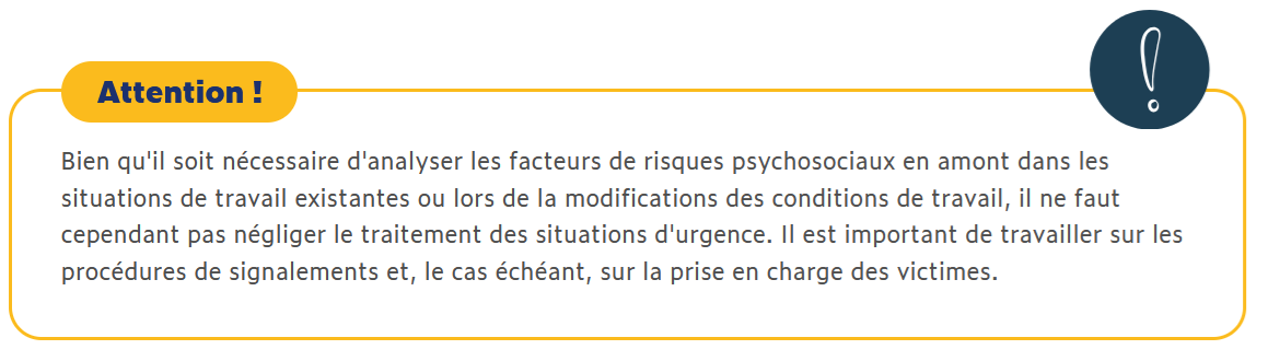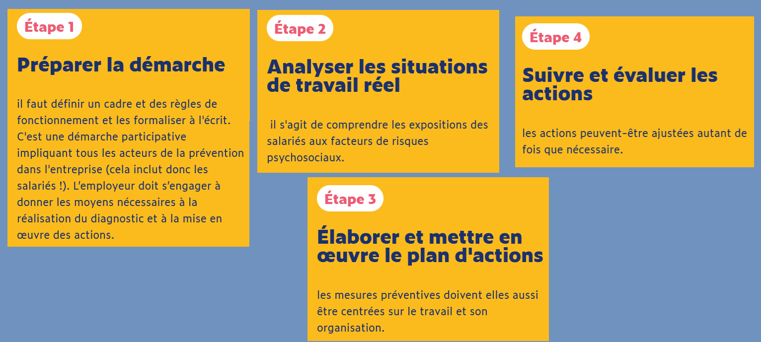 Dans le cadre des risques psychosociaux, il faut privilégier une démarche de prévention collective axée sur le travail et son organisation. Il ne s’agit pas d’évaluer individuellement la psychologie de chaque salarié.