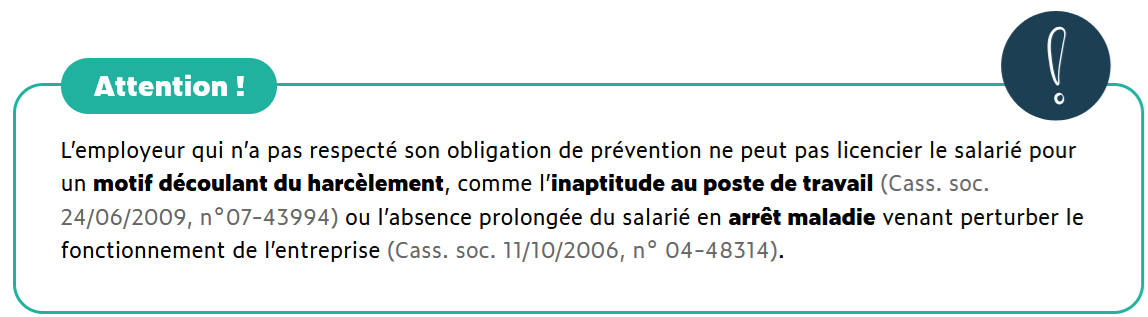 L’employeur a la double obligation de prévenir le harcèlement (art. 1152-4 C. trav.) et d’empêcher qu’un salarié le subisse (art. 1152-1 C. trav.). En raison de cette distinction, la méconnaissance de chacune de ces obligations, lorsqu'elle entraîne des préjudices distincts, peut ouvrir droit à des réparations spécifiques (Cass. soc. 19/11/2014, n° 13-17729).