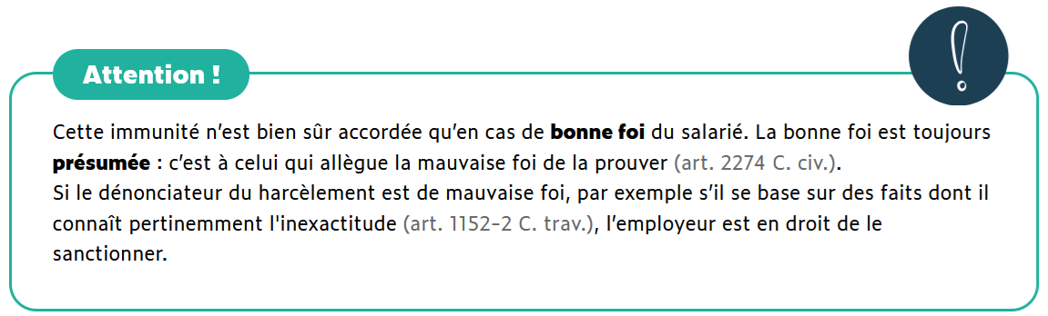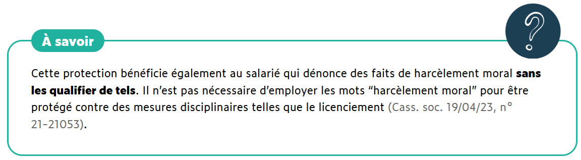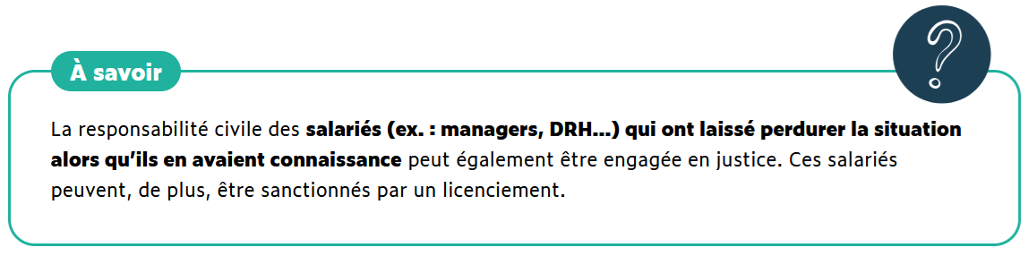 Le salarié victime de harcèlement doit engager une procédure devant le conseil de prud’hommes contre son employeur, même si ce dernier n'est pas l'auteur direct du harcèlement. Dans ce cas, l’employeur sera jugé pour ne pas avoir protégé la salarié contre le harcèlement (Cass. soc. 21/06/2006, n° 05-43914).